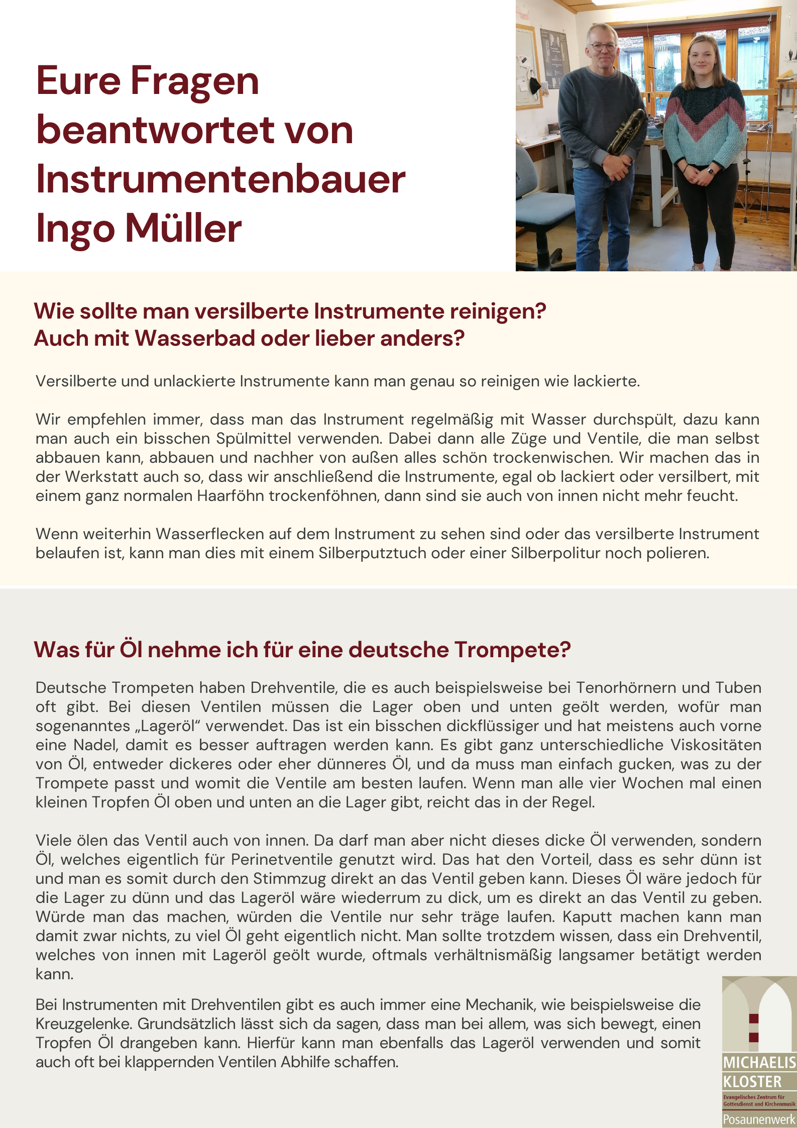Über Instagram und Facebook haben wir euch gefragt, ob ihr Fragen zum Thema Instrumentenpflege habt. Mit diesen Fragen im Gepäck ging es dann ins beschauliche Wilstedt zu "Kromat Blechblasinstrumente", wo auch der Instrumentenbauer Ingo Müller beschäftigt ist. Innerhalb eines Gespräches haben wir ihm eure Fragen gestellt und festgehalten, was seine Antworten darauf waren.